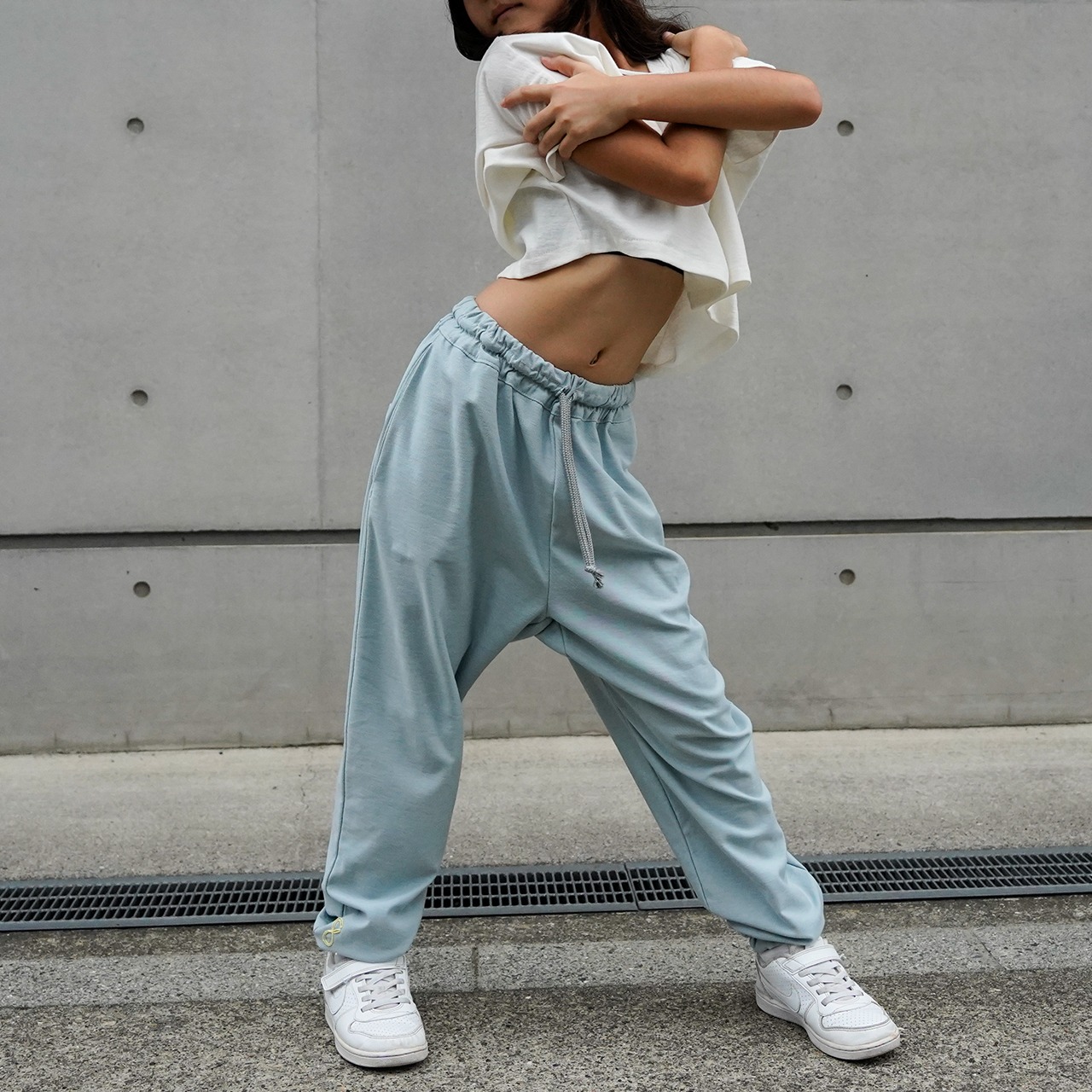 ・アッシュライトブルーは他のお色より少ししっかりとしたTシャツなような素材ですが同じ天竺素材(コットン100%)。この色はパンツと同素材になります。